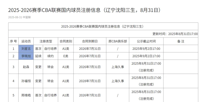 虎扑08月31日讯 CBA官网更新2025-2026赛季辽宁队的国内球员注册信息。