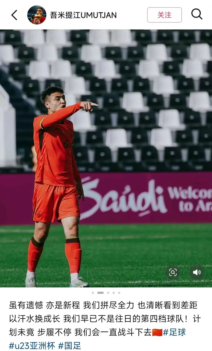 出场较少的木塔力甫仍在为迈进国足大门而努力。“这个梦想还没有实现,因为我现在踢的是U系列国家队的比赛,要想成为成年国家队的一员,我还得继续努力。”2024年卡塔尔U23亚洲杯暨巴黎奥运会亚洲区预选赛开赛前不到一周,因伤退赛曾让他备受打击;两年后在沙特,他第二次为这项洲际大赛而全力备战,并且如愿以偿。